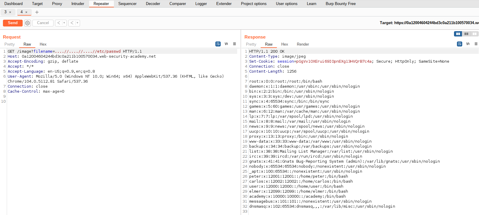 For solving the lab, we change the filename parameter path to /etc/passwd and sent back our request to the server through repeater. Repeater is an handy tool that enables one to replay and manipulate http requests.