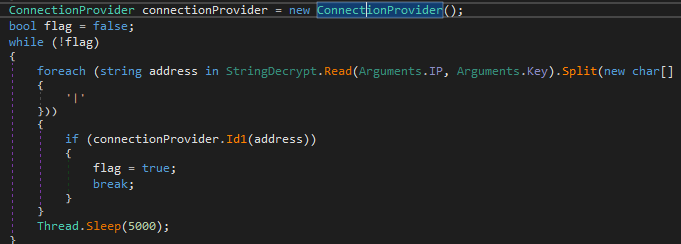The second part of our analysis is determining IP address in which the malware is communicating to.The Ip address of the malware seems to be encrypted as shown in the image below. StringDecrypt function takes two arguments, the IP address and Key and decrypts the address