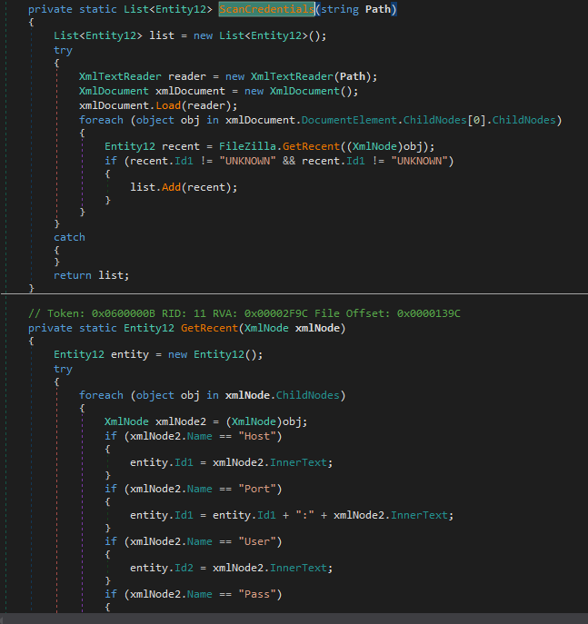 The malware scans for the saved credentials used by Victim in transferring files to other machines. The malware collects host, Port, User, Pass of the machines