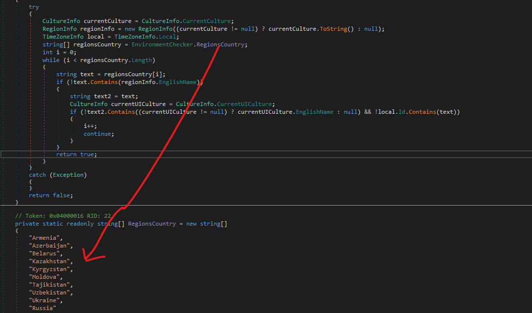 The malware check if victims region country is within the array of the strings shown above and if the does not contain EnglishName.