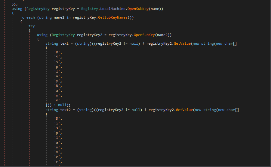 The malware enumerates installed application through use of registry. Querying of registry is an effective way of finding out all installed applications in Windows. The malware gets the program name and version as shown by text and text2 strings.