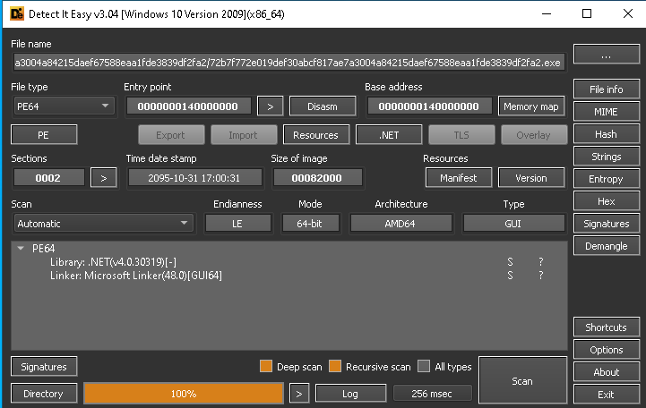 The sha256 hash of the sample is 72b7f772e019def30abcf817ae7a3004a84215daef67588eaa1fde3839df2fa2. First step is loading sample in Detect it Easy tool to check whether is packed or not.