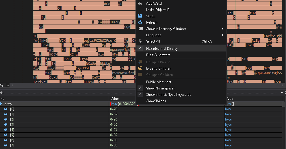 By examining the values in image above,we can examine the array we passing to the object method. Looking at the bytes data of the above array, the first two bytes are magic number of PE file 4D5A or ascii MZ. From the first two bytes we can make an assumption the buffer is our second stage binary. Right click the buffer memory to save the sample.
