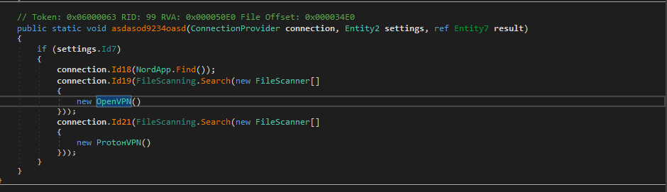 The malware scans for Victim`s configuration files and profiles of various VPNs installed on the device. The malware scans File configs NordVPN, OpenVpn configs and ProtonVPN profiles.