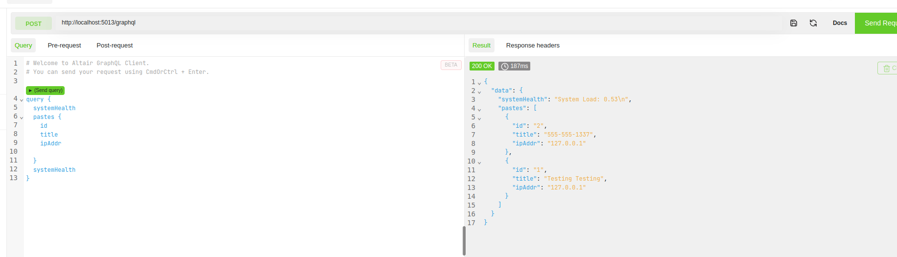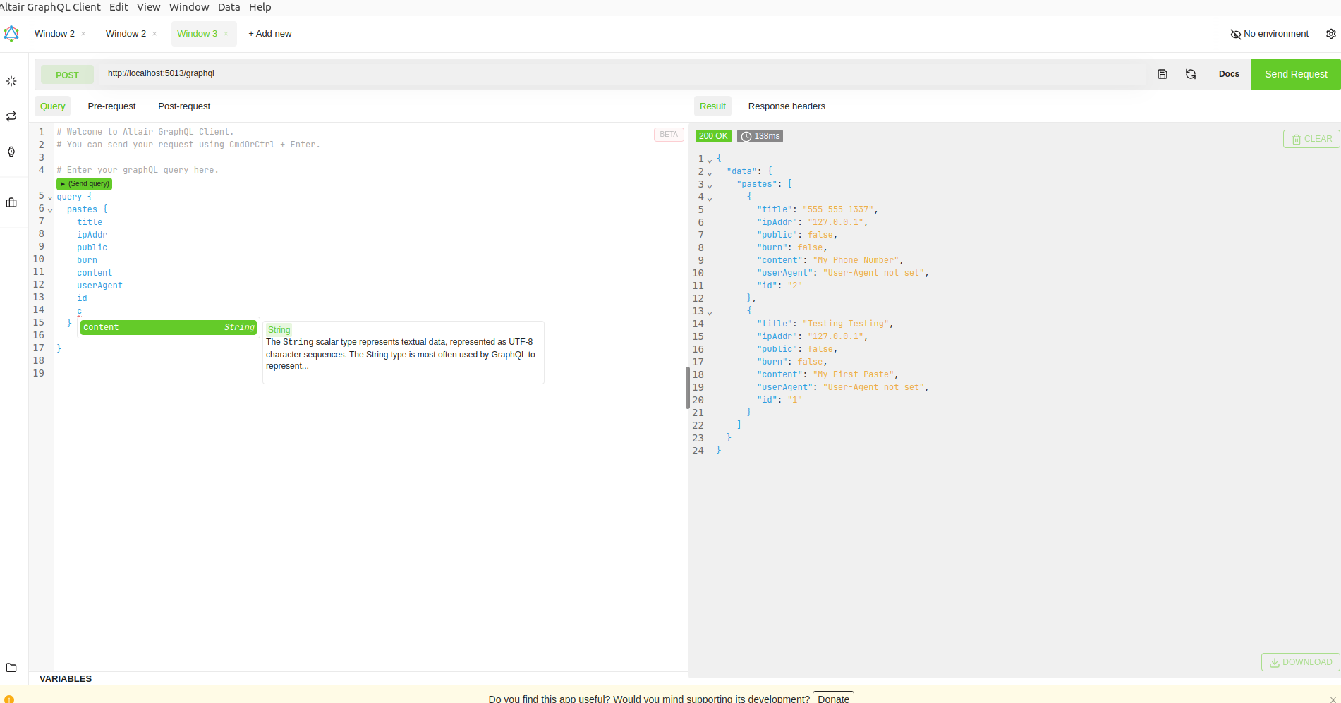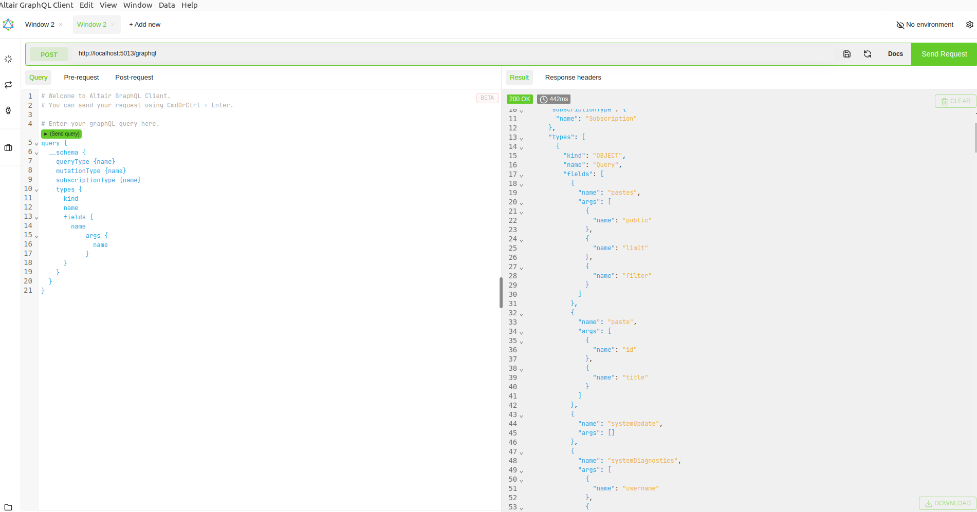 }Running the above query using Altair GraphQL Client, we are able to explore custom types defined in the API GraphQL schema. These include queries, mutations and subscriptions and their types. For example some defined types include CreatePaste, EditPaste, ImportPaste, CreateUser, Login and many more as shown in figure below.