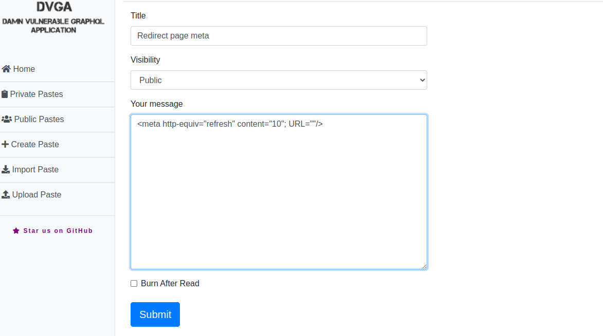 Figure below shows a DOM based title stored XSS, because there no validation of title data, this leads to XSS payload being executed when a user visits the page. Create a new paste as shown in the figure below and pass the XSS payload in the title argument.