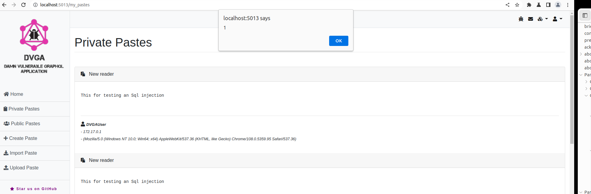 Server Side Request Forgery are vulnerabilities that allows an attacker to alter intended behavior of the server. An attacker may be able to make to make an outbound connection, steal internal resources of the organization, exploit internal systems not reachable from the internet and even query metadata endpoints to get secrets i.e AWS. DVGA contains an SSRF vulnerability as a result of a code injection in the importPaste query as shown by the query below. (SSRF via code injection).