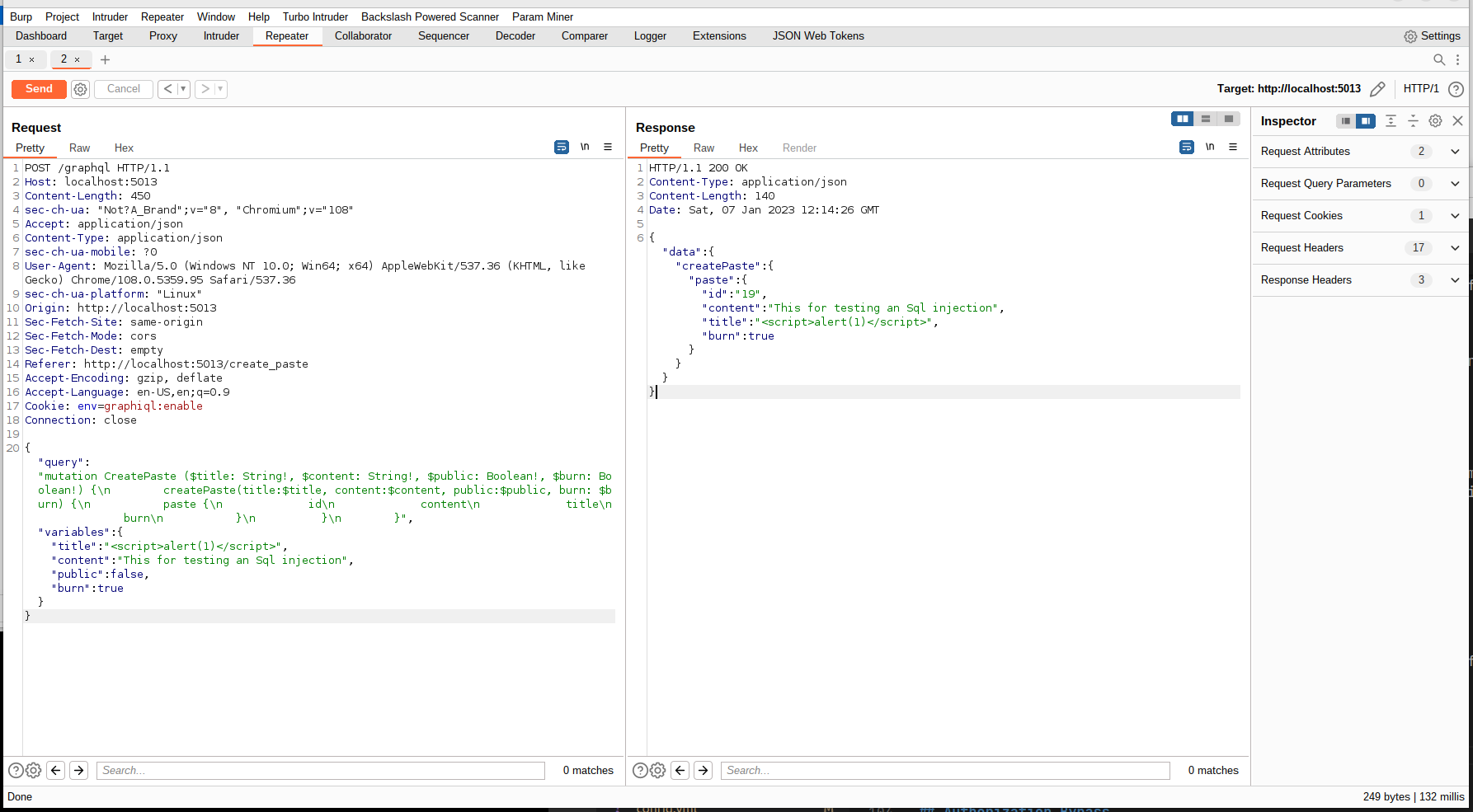 }Run the Query above in the BurpSuite repeater toolkit. This enables us to replay requests sent to the server by the client.