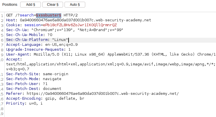 In the attempts to solve the Portswigger Academy XSS challenges, we will use the xssbuster string as our placeholder string for tracing the application’s sinks.
